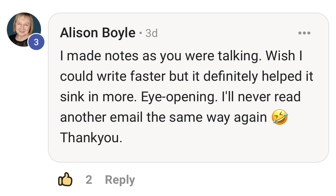 When we worked together they started crafting emails that entertain their audience and sell more of their offers in 20 - 30 minutes a day (sometimes even in less).