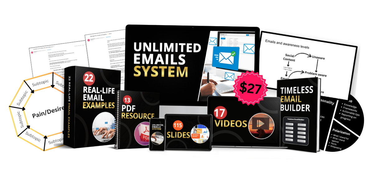 The Unlimited Emails System is a 3-step framework designed to help you create unlimited, attention-worthy emails that entertain and sell your offer consistently.